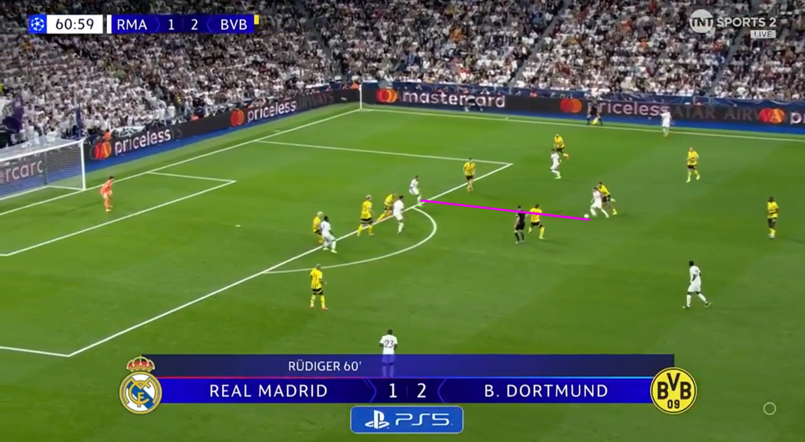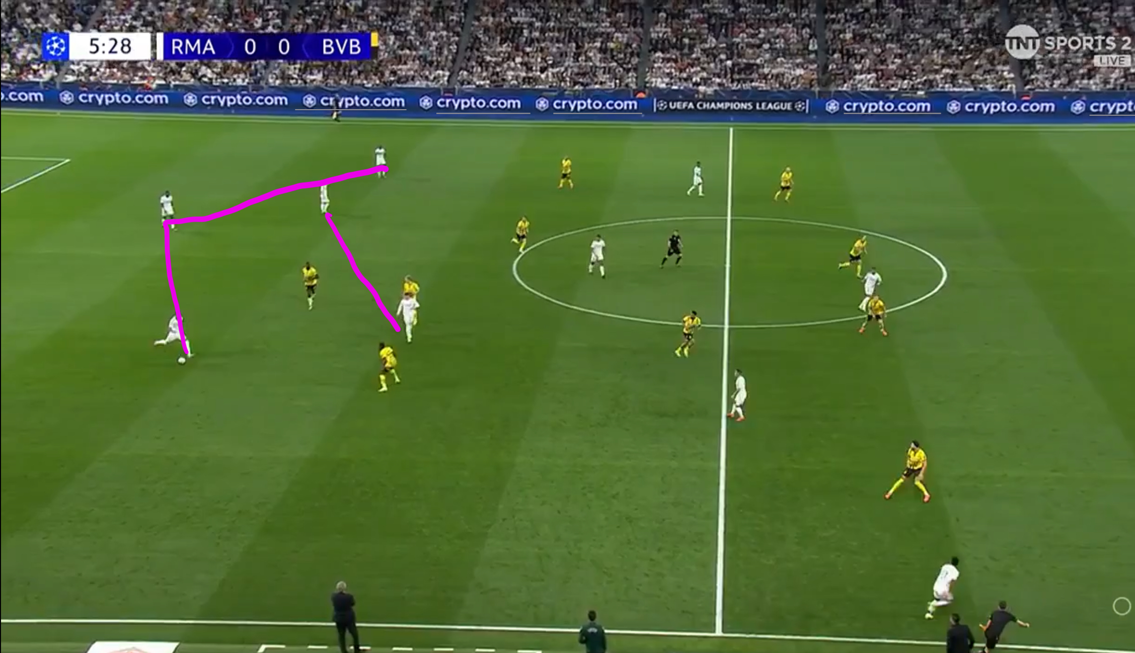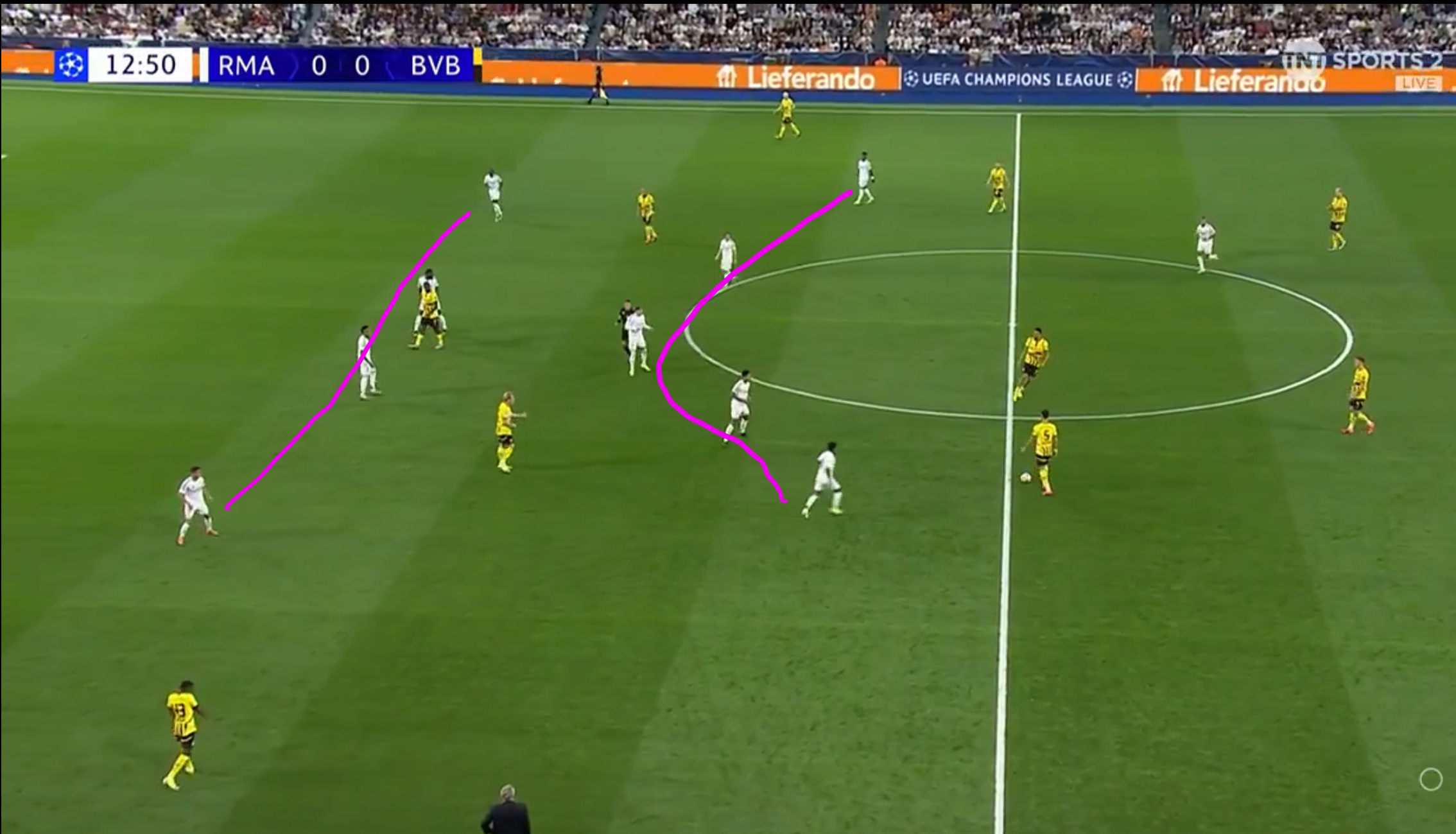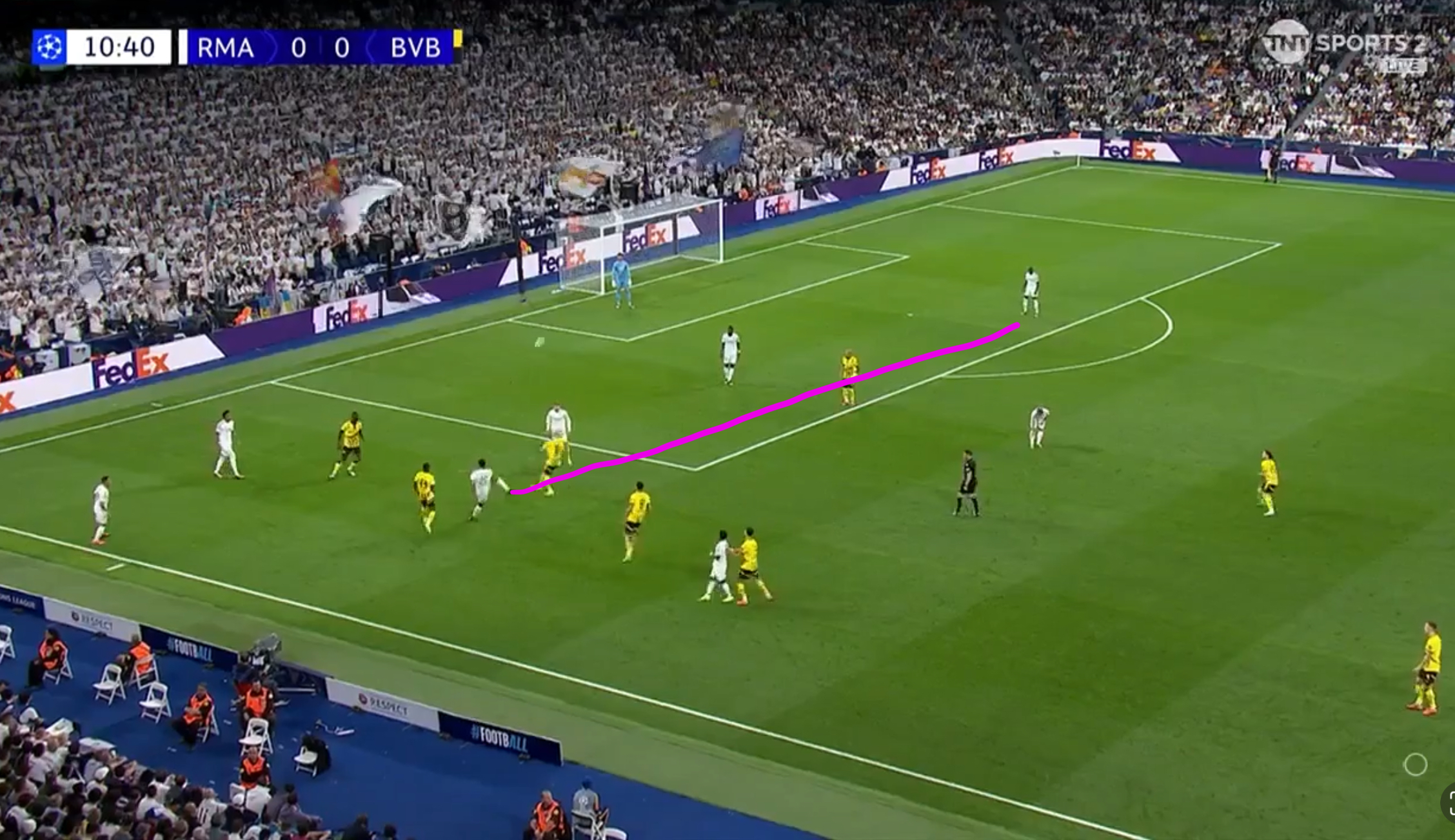 레알에서는 벨링업 호드리구 비니시우스 음바페 같은 선수들이 침투 움직임이 좋아 뒷공간으로 패스를 주는 퀄리티를 많이 신경써서 준다